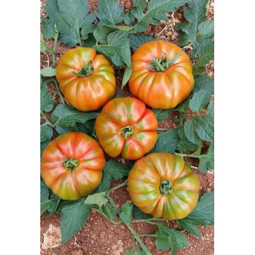 Basık ve dilimli köy domatesi, 320-340 g, et rengi kırmızı, sert ve kaliteli, yeşil hasada uygun, raf ömrü uzun.